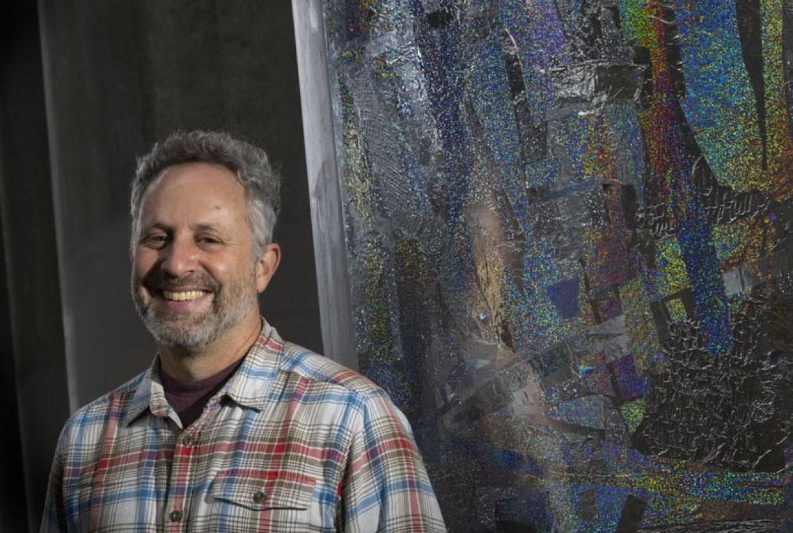 Facing one of his seven “charms” — made from overlapping sheets of thin holographic and dichroic film, aluminum foil, duct tape, chocolate bar wrappers and glitter — Offenbacher’s theory suddenly springs to life. As if divinely ordained, a ray of morning sun broke through an opening in the concrete ceiling and spotlighted the collage, which transformed into a glittering rainbow.