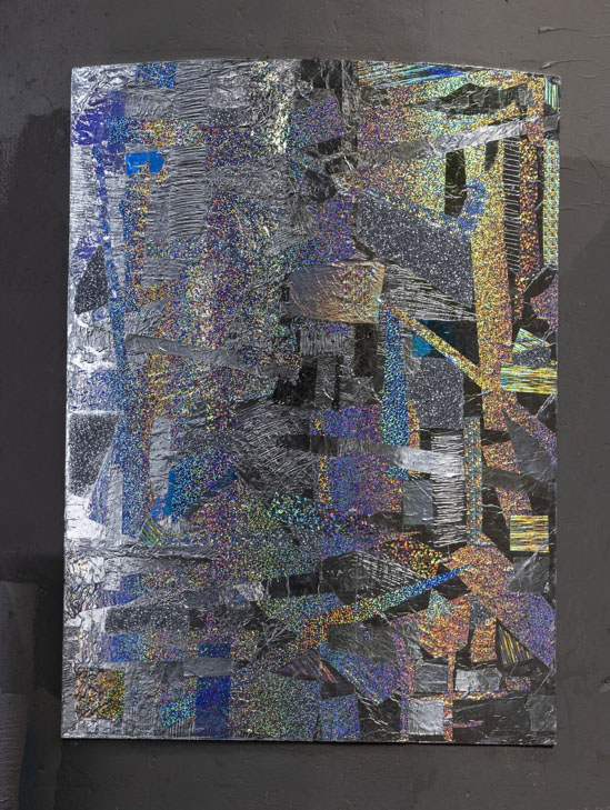 “I made these paintings using aluminum foil, holographic film and glitter, and am thinking of them as protection charms for the city,” Offenbacher writes about the showing.