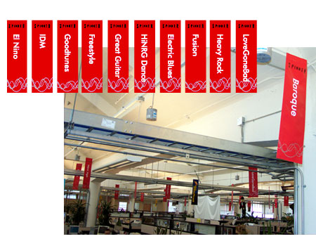 PROJECT: MY ROLE: I designed a series of banners to decorate their offices. They have banners for all the AOL music brands: SHOUTcast, WinAmp and NullSoft. Rollover for more banners and a view of their entrance (covered in the Spinner silver wave identity element). |