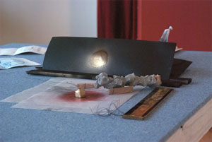 Among the 430 objects collected: a die-cast 1957 Chevy Bel-Air model car, a translation of Spinoza’s famous ring in unfired clay and gold spray paint, a vial of buckminsterfullerene, fossil teeth, two full bookshelves of art books and periodicals, suggestions from the chief curator of the Frye Art Museum on how to approach a problem, an odd clear cast-plastic fork, an old typewriter, a beat-up copy of Dr. Ruth Westheimer’s The Art of Arousal.