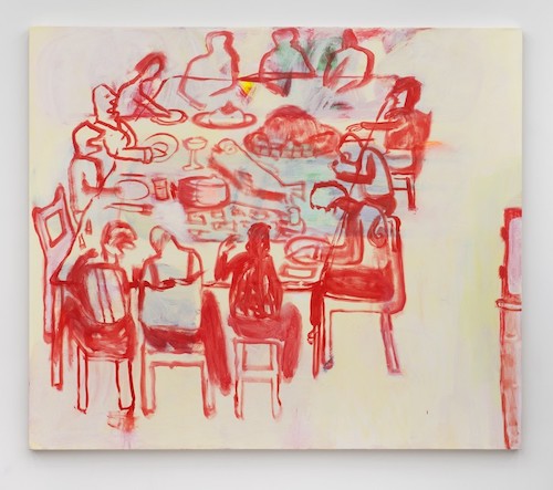 A cadmium red line sketches out twelve people sitting around a table, plus an empty chair. Anyone steeped in Western art history or Christianity will recognize the arithmetic of 12+1. If this is to be a Last Supper, however, where did Jesus go? It doesn’t seem to matter. Twelve people sit around a table set for a sumptuous, if odd, meal. Some are talking across each other, some intently focus on their plates. One person has a morsel balanced midway to their mouth. Two lean towards each other for a private conversation. I imagine the conversations as equal parts vicious gossip and boring blah blah, barbed and loving. Your typical family meal, wherever you find family.