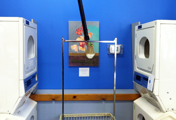 Past the nice big galleries with high ceilings at Howard House is a crowded area with rows of plastic-wrapped paintings leaning on each other and a few unwrapped artworks sitting or hanging, attempting to exhibit themselves despite their surroundings.