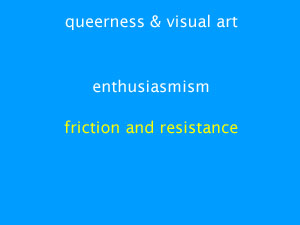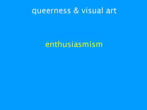 Some of these artists would definitely identify themselves as queer, many of them would not. What brings them together is my appreciation of their work (and there could have been many more), and also my hope that they’ll help illustrate some of the ideas I’m about to share with you. I have three ideas today. The first of which is: Enthusiasmism.