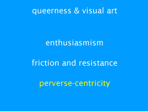 Perverse-Centricity: What would a queer world look like? I think it would be somewhere where perversity is especially appreciated. Somewhere where the margins switch places with the center. Or even better, somewhere where we can imagine the world without centers and margins.