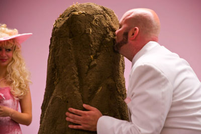 So, what is it with Seattle and sewers? Not only is one of our most popular tourist attractions organized around them, excrement and its disposal frequent our contemporary art. There is Susan Robb’s show at Lawrimore Project this month, where I’ve heard that Scott Lawrimore’s excrement will be used to generate the electricity that powers the rest of the installation. Jenny Heishman exhibited her drippy brown sculpture Mud Thing at Howard House this past fall. Steven Miller married an excrementally shaped human-sized pile of dirt on wheels a few years ago. Eric Elliot’s paintings are heavy with fetid paint. You can probably think of other examples. Alex Schweder is maybe our old master of this genre. He has built his career around integrating an interest in excrement with that other consuming Seattle passion, architecture. In his work, architecture stands-in for repressive authoritarian forces while body fluids promise liberation. In other words, the state represses shit; art redeems it.