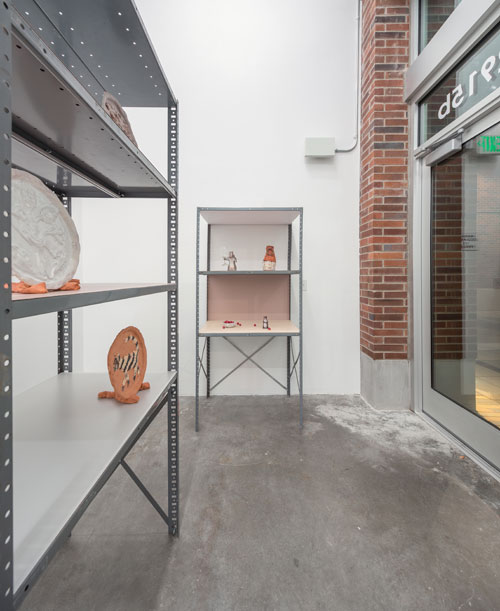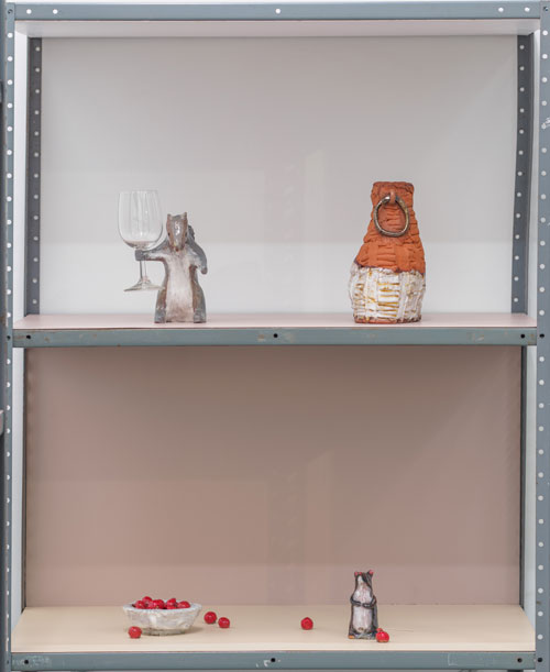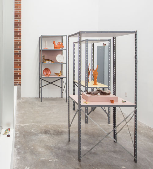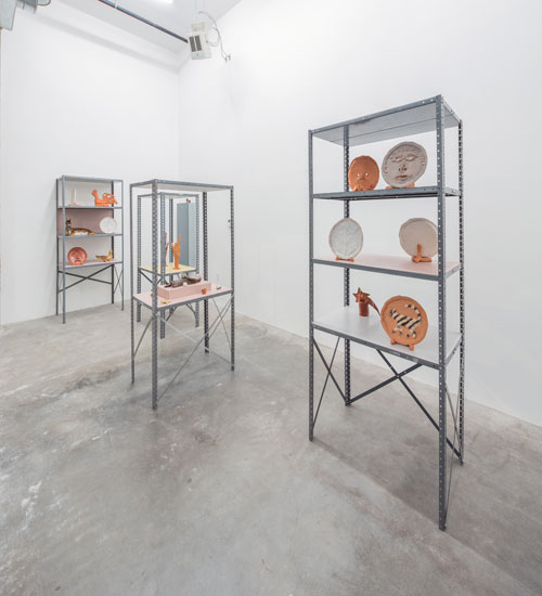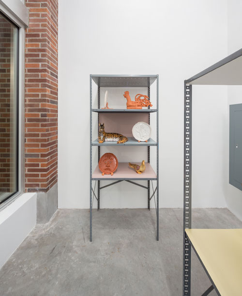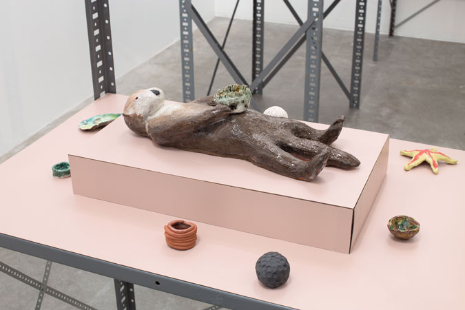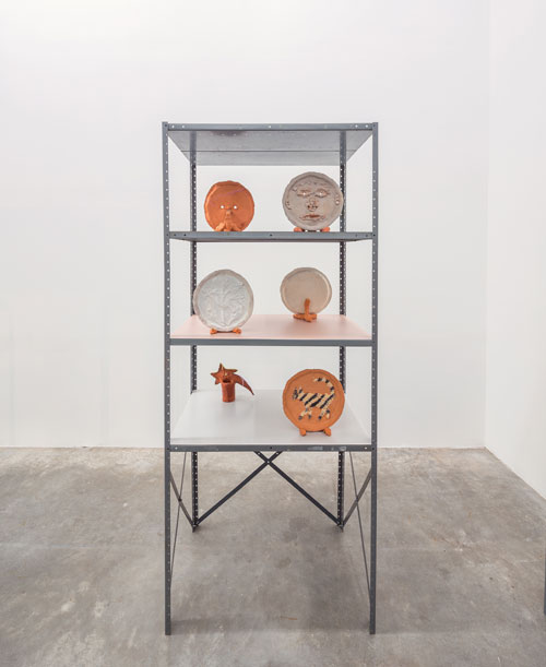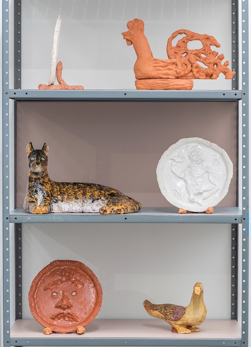 glazed and unglazed earthenware, glass, seashells, laminate, steel shelving